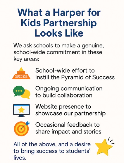 When a school partners with Harper for Kids, we provide everything needed to bring Coach Wooden’s Pyramid of Success to life at your school. Our goal is to build a long-term partnership that supports your educators, students, and community.